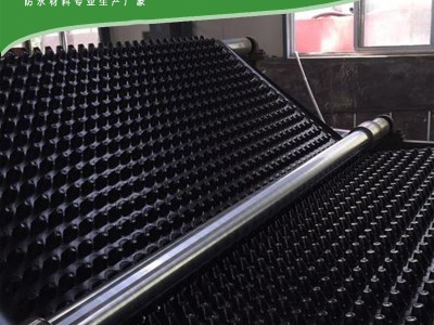 塑料排水板是由聚乙烯(HDPE)为原料,塑胶底板经过冲压制成圆锥突台而成。圆锥突台的顶面铺设一层过滤土工布,以阻止泥土微粒通过,从而避免排水通道阻塞使通道排水顺畅。 传统的排水方式使用砖石瓦块作为导滤层、使用较多的鹅卵石或碎石作为滤水层、将水排到指定地点。而用排水板取代鹅卵石滤水层来排水则省时、省力又节能、节省投资、还能降低建筑物的荷载。良好的排水系统对土建的施工周期及构筑物的正常使用和寿命具有重要的作用。排水板与多孔渗水管组成一个有效的疏排水系统,圆柱形的排水板与土工布也组成一个排水系统,从而形成一个具有渗水、贮水和排水功能的系统。